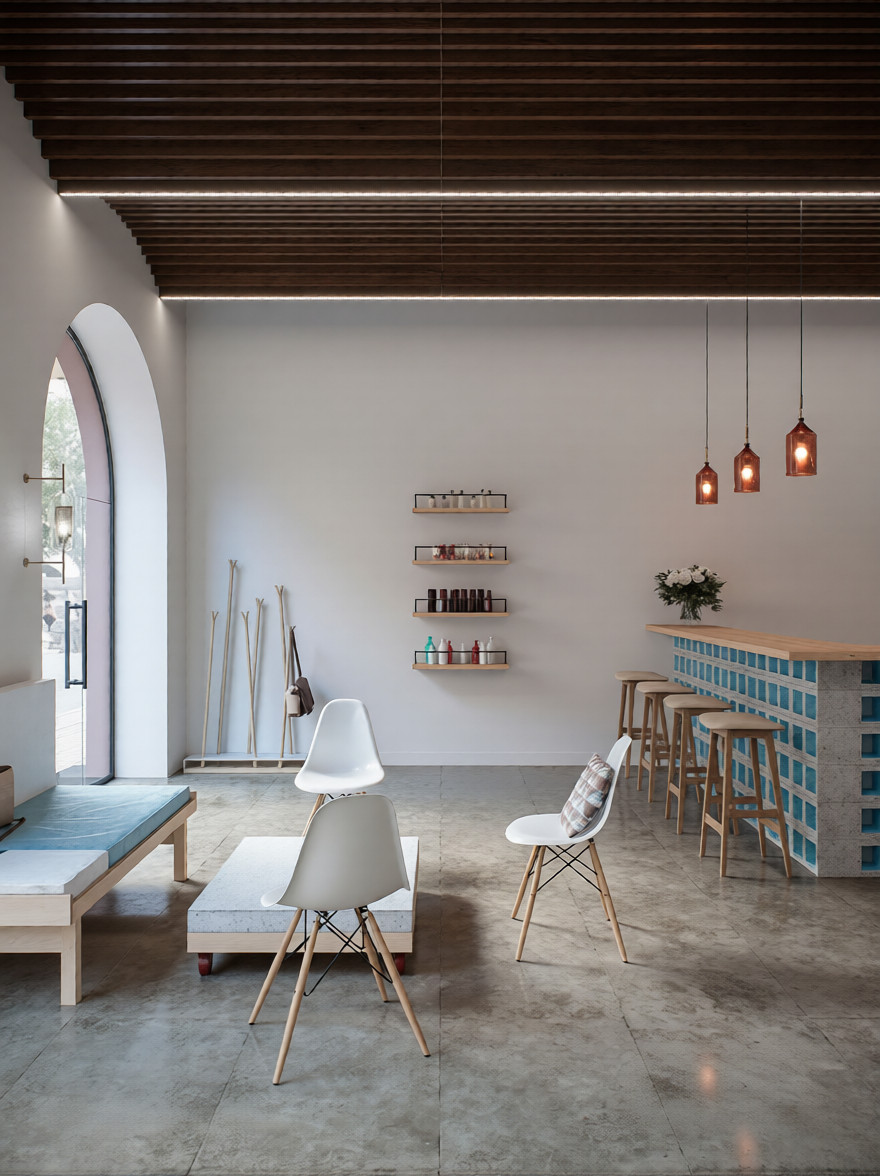 В данном случае дизайнер также использовал некоторые элементы лофта - побеленная кирпичная стена, барная стойка из бетонных шлакоблоков, зеркала странных форм и размеров и другие интересные решения. Например дверные и оконные проемы решили "обыграть" с помощью реечного подвесного потолка. Подвесной потолок из кубообразной рейки в форме арки повторяет верхний изгиб проемов, добавляя интерьеру самобытности и индивидуальности.